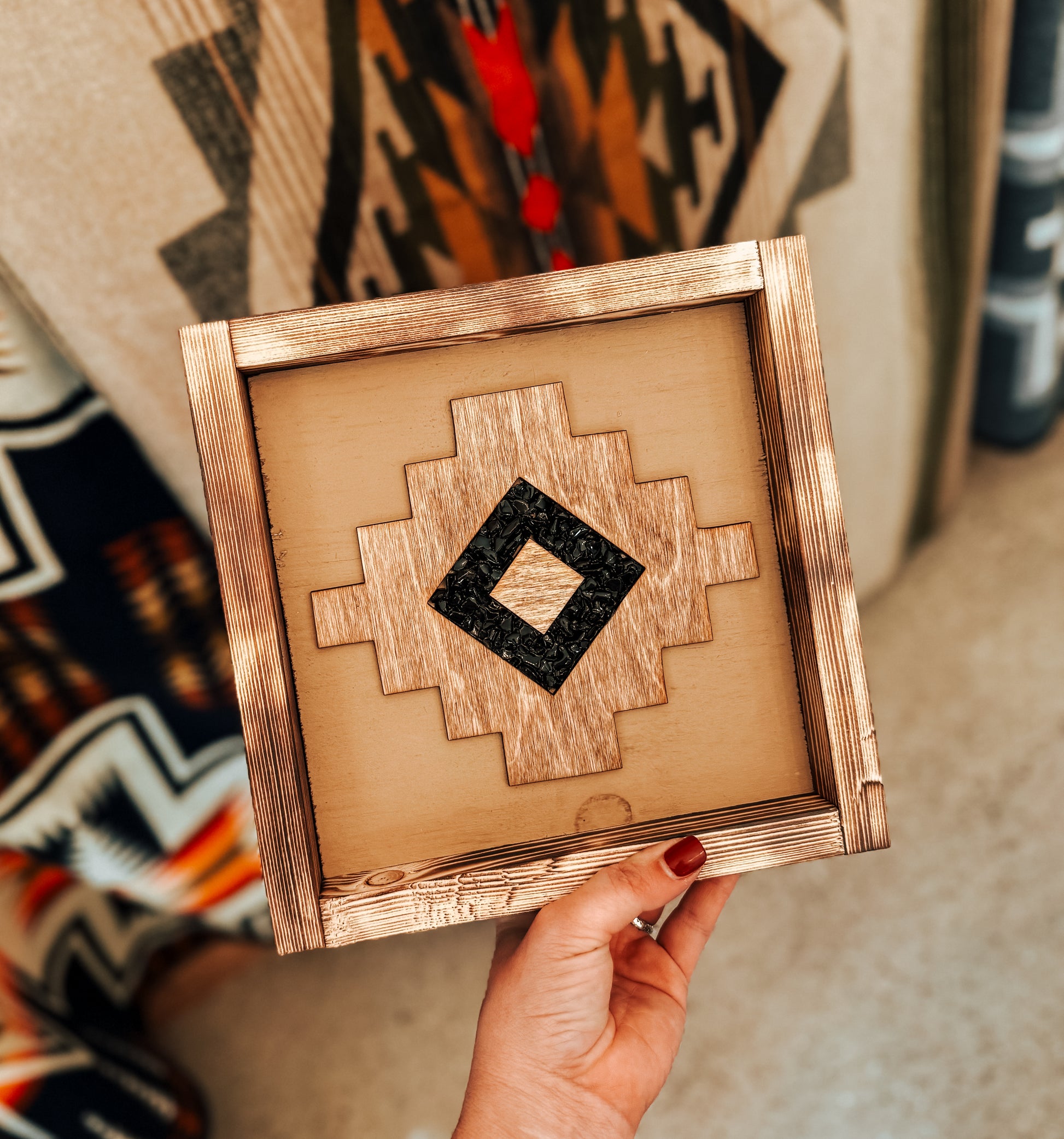 Southwestern style in neutral. This piece is a 9” x 9” sign with black stone inlay. Please allow 4-6 week TAT, handbuilt item.