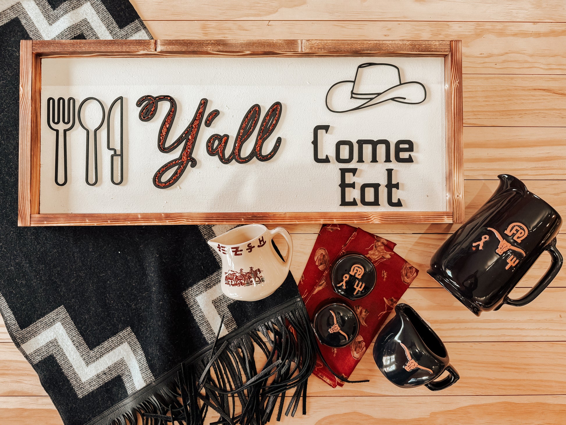 Measures 11” x 27”, cream with wood stenciled detail, burnt frame and goldstone inlay. Inlay color can be different, please let us know if you’d like a different stone color. This listing is for one sign.